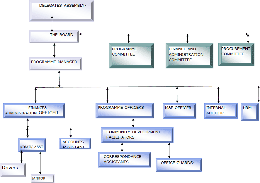 8. The Programme Manager reports to the board and is at executive level and leads the management team and is responsible for all operations in the organization; in absence of the Programme Manager, any Programme Officer acts on his/her behalf.Program Officers report directly to the Programme Manager; in absence of a Programme Officer, any other Programme officer or a Community Development Facilitator may act on his/her behalf.