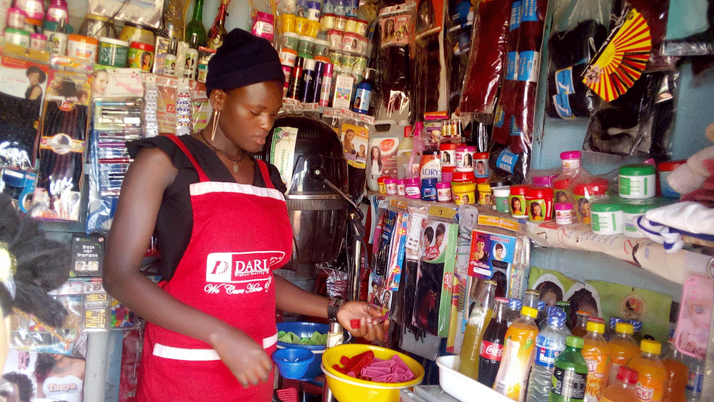 Rachael was trained in micro enterprise management and hair dressing under vocation skills development project. She was given start up tools and started operating her own hair salon business. She earns USD 111 per month and saves USD per week in a Village Saving and Loans Association (VSLA)